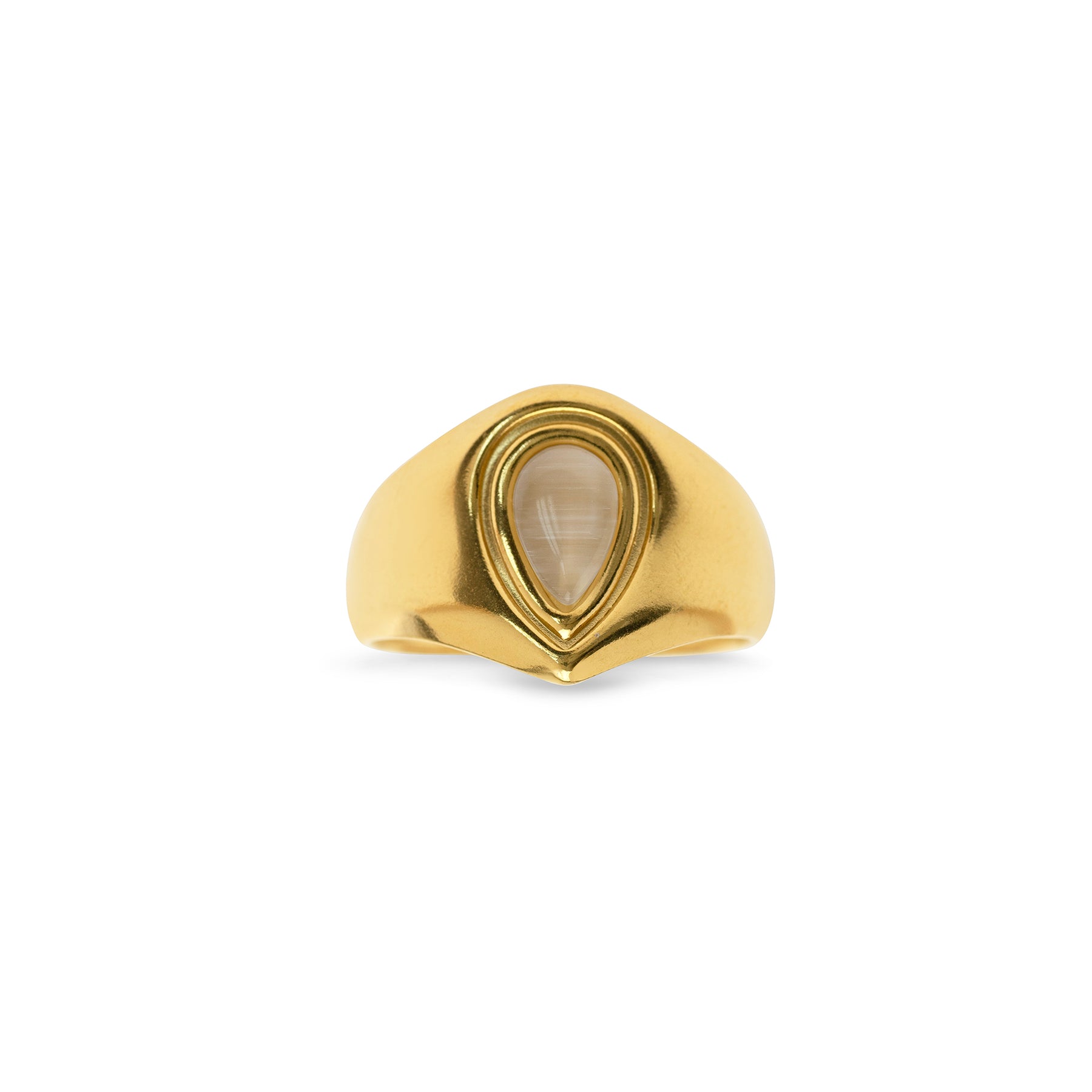 Natural elegance with this stone ring. Featuring a smooth stone inlay, this stainless steel ring is water-resistant and tarnish-free for everyday wear. Plated in 18k gold for a luxe feel.