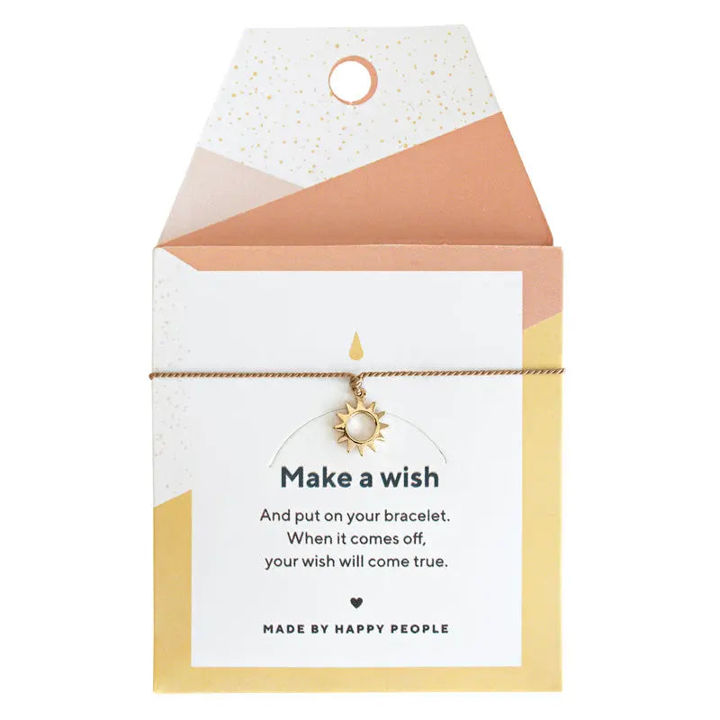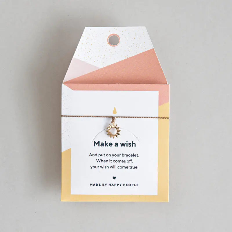 Shine bright like the sun in this beautiful silk bracelet. Make a wish and put on your bracelet. When it comes off, your wish will come true. This bracelet comes with our gorgeous packaging. Brass base with gold plating 100% silk cord Size: Adjustable with oval shaped lock Lead, nickel and cadmium free