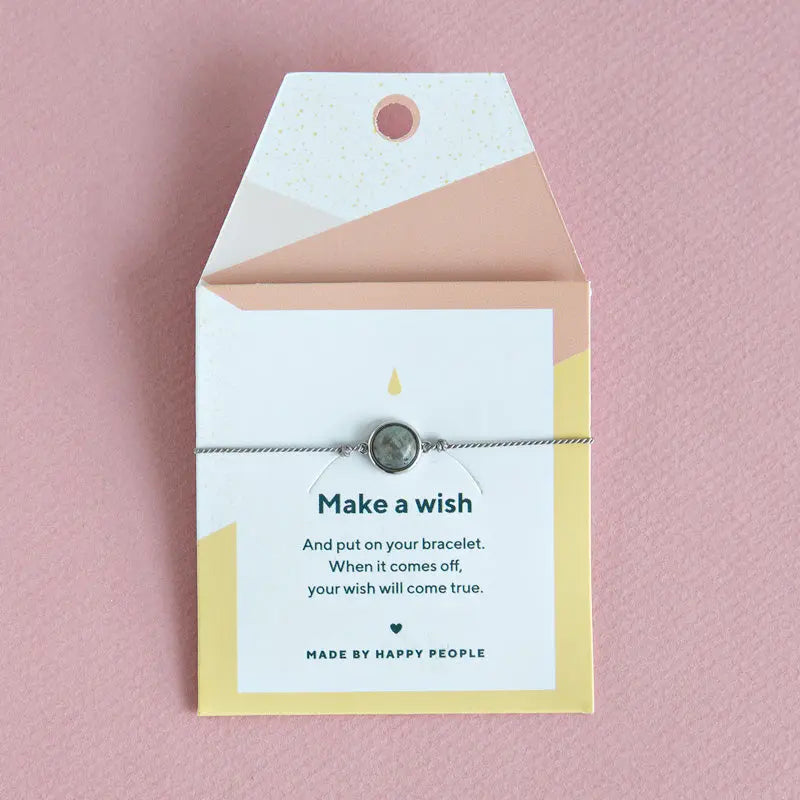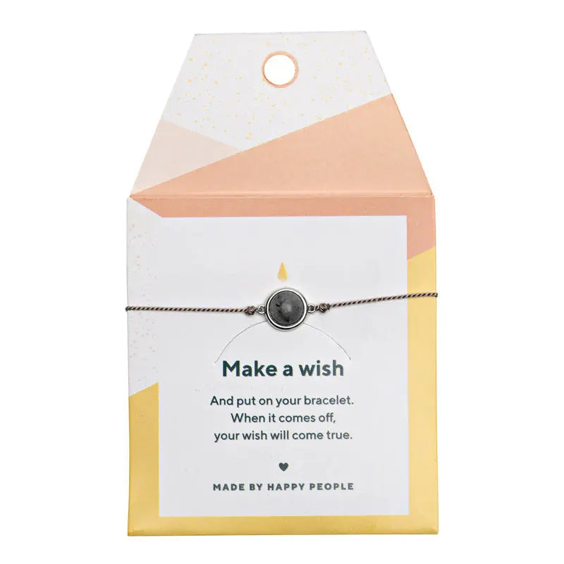 A simple and elegant bracelet with a beautiful grey stone. This bracelet has a very sophisticated look. Make a wish and put on your bracelet. When it comes off, your wish will come true. All of our bracelets come with our gorgeous packaging. Brass base with silver plating With Resin setting 100% silk cord Size: Adjustable with oval shaped lock 8 mm shaped brass charm Lead, nickel and cadmium free