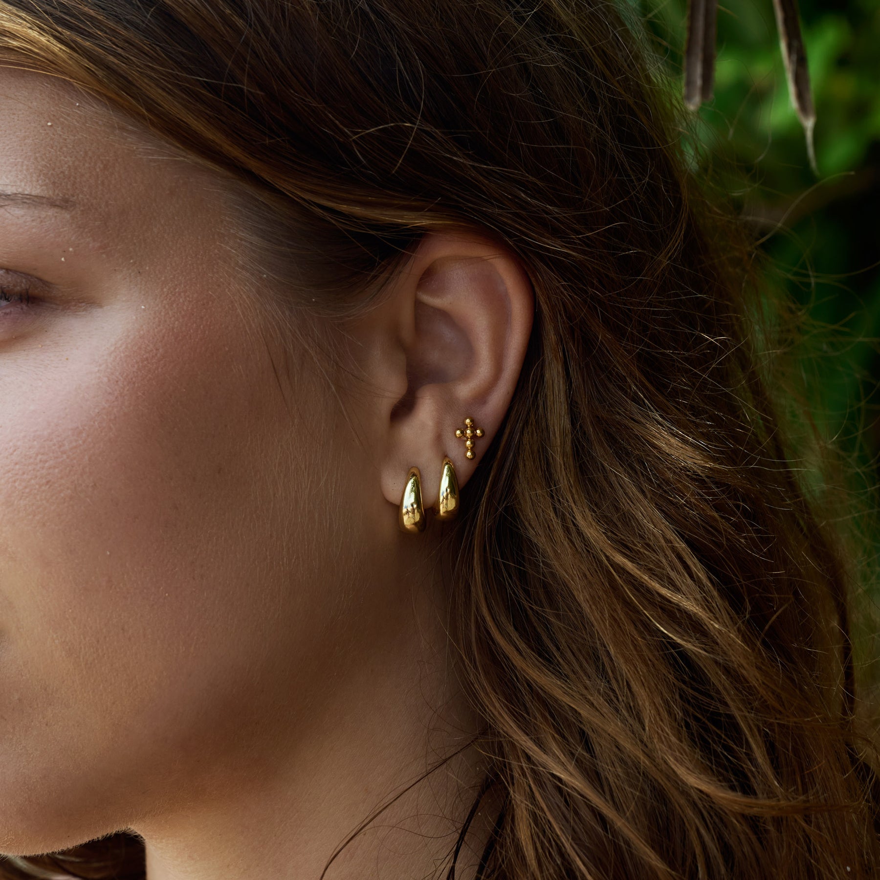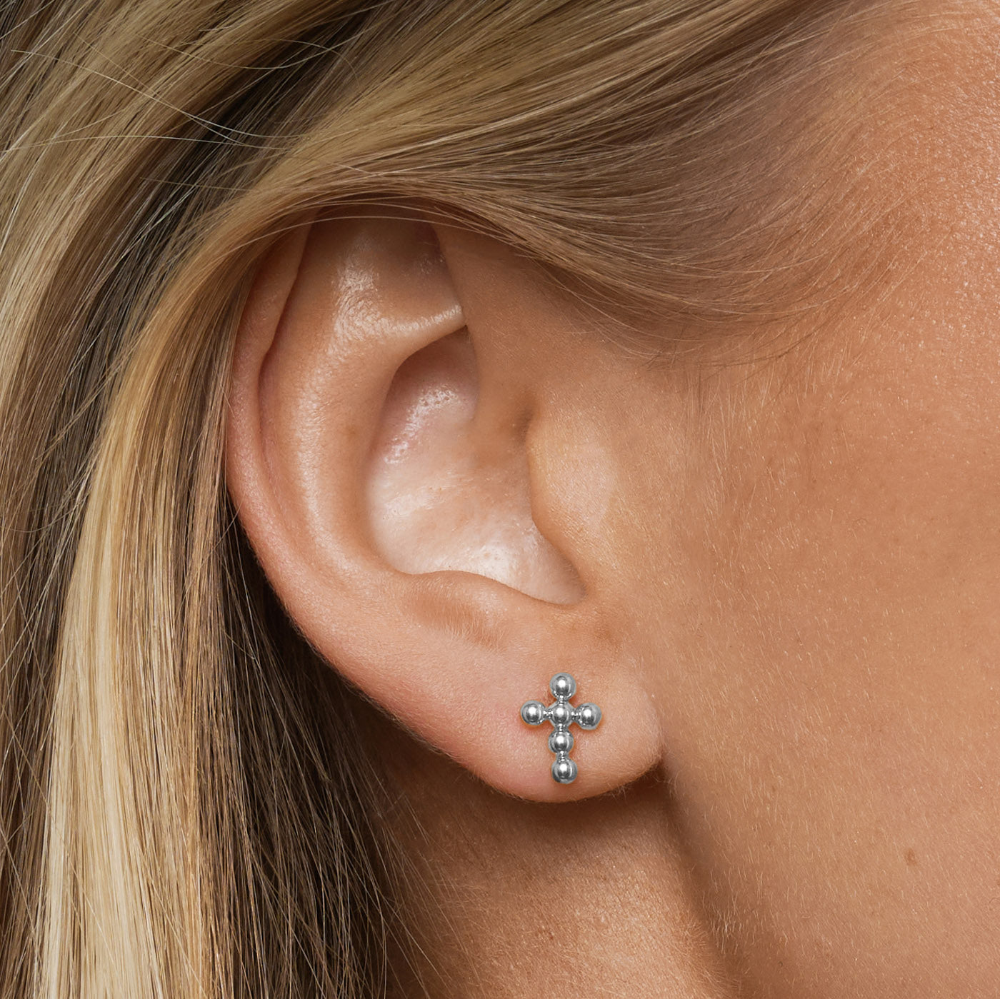 Tiny, shiny and full of attitude. The Tia mini cross earrings bring playful edge to your ear stack. Luxe finish and lightweight feel. Available in silver & gold.